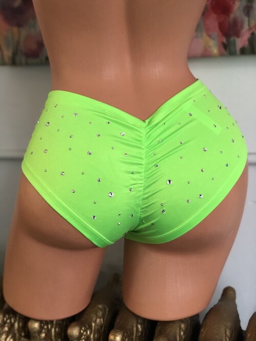 Get ready to turn heads with these cheeky bartender style booty shorts. Made with premium spandex and embellished with high-quality Czech crystals, these shorts offer four-way stretch for maximum comfort and style. Perfect for any body type, these shorts are designed to fit most sizes with ease. Make a statement and stand out from the crowd with these fabulous, unique shorts.