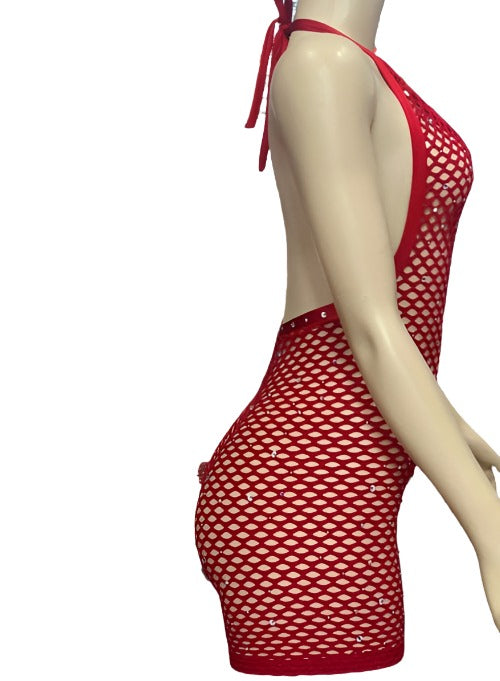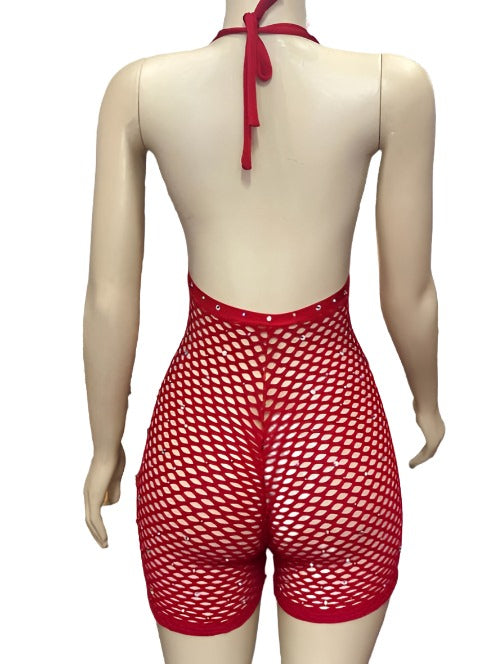 Red net shorts jumper with crystals. One size fits most size small thru large. Our clothes are made with only premium spandex fabric and proudly made in the USA. Experience the ultimate in comfort and style with our premium spandex fabric and expertly crafted design. Each piece is proudly made in the USA and is available in one size that fits most - from small to large. Say goodbye to ill-fitting clothes and hello to flawless fashion.