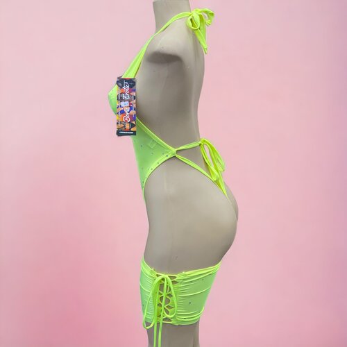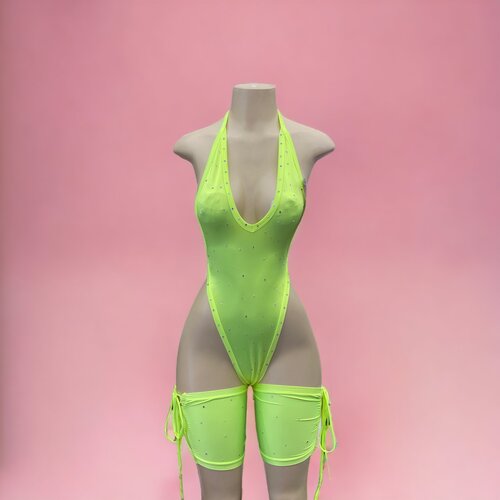 No backsie bodysuit paired with thigh bands laced up. Neon colors glow in black light in the night club, so you won’t be missed! Available in many colors. One size fits most. Made in the US. - Made from breathable and stretchy fabric for all-day comfort. - Perfect for any night out with its vibrant neon colors that illuminate under black light. - One size truly fits most, making it easy to find the right fit. - Made in the USA with quality and durability in mind.
