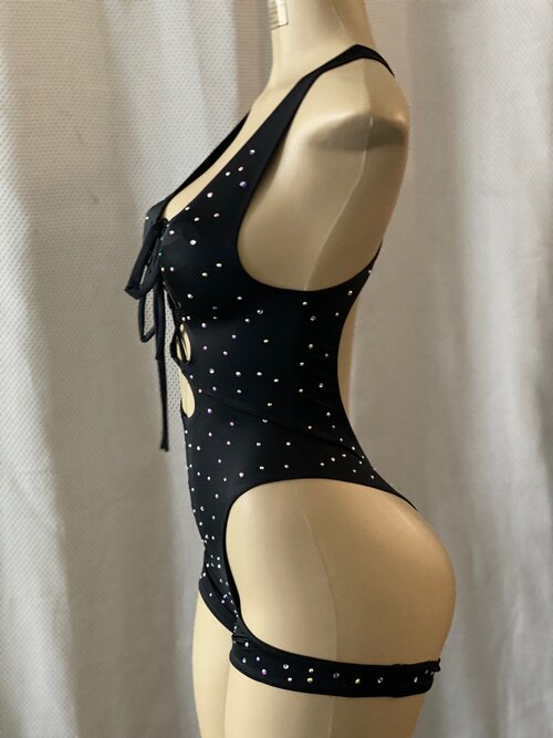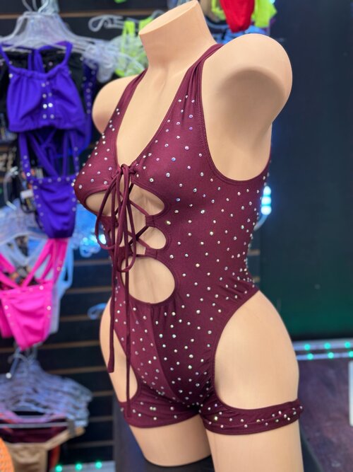 Reverse chap romper cross back lace up front jumper embellished with crystals. For dancers and or bartender /bottle girls. This versatile jumper comes in all colors. Contact me if customized adjustments needed. Featuring elegant lace and sparkling crystals, this hybrid design is ideal for dancers and bartender/bottle girls alike. The reverse cross back and lace-up front add a chic touch, and with customizable adjustments, it's a perfect fit for everyone. Available in a range of vibrant colors.