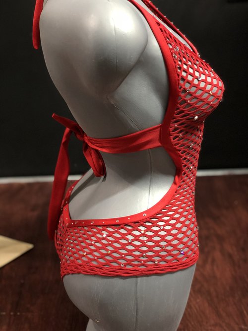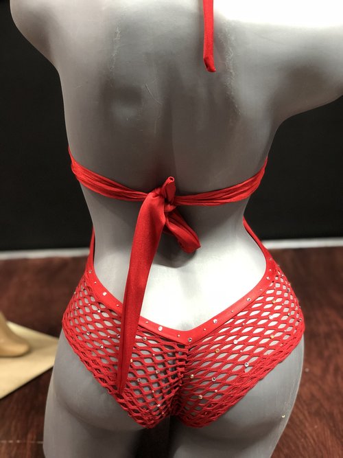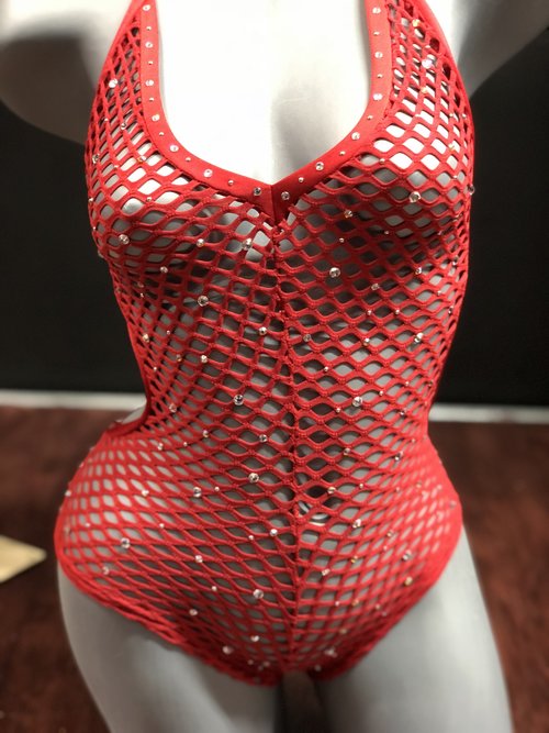 Red net romper tie around neck with breast support scrunch butt shorts. One size fits most. Made with premium spandex fabric for maximum stretch. Made in the USA. Expertly designed for comfort and style, our Red Net Romper will offer you the perfect fit with breast support and scrunch butt shorts. It's made with high-quality, premium spandex fabric that ensures maximum stretch for a comfortable wear. Plus, it's proudly made in the USA for a quality you can trust.