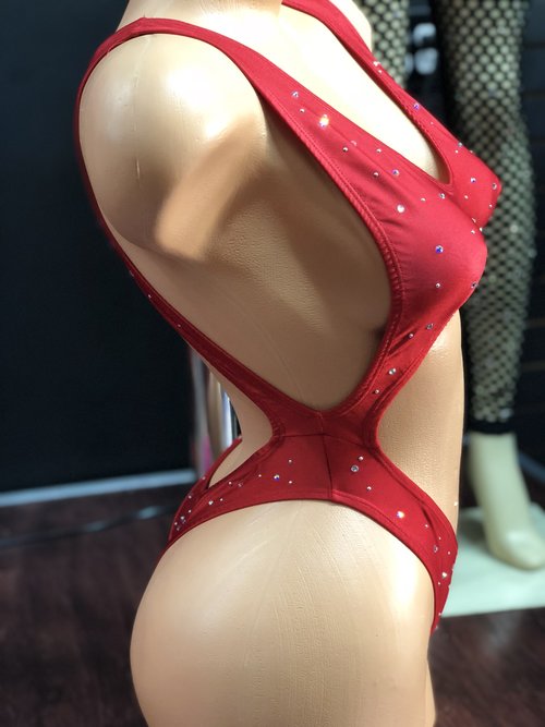 Red keyhole Bodysuit w crystals made with premium spandex fabric. One size fits most size small thru large. Expertly crafted with the highest quality spandex fabric, our Red Keyhole Bodysuit is designed to fit comfortably on a range of sizes from small to large. Its crystal embellishments add a touch of glamour to your wardrobe, making it perfect for any occasion where you want to stand out.