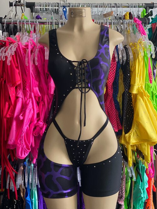 Half cow print open chap w/ free bling thong. One size fits most. Made in the US with premium spandex fabric for maximum stretch. Expertly designed for both style and comfort, these chaps feature a unique cow print and come with a complimentary bling thong. Made in the USA with premium spandex fabric, they offer maximum stretch for the perfect fit. One size fits most.