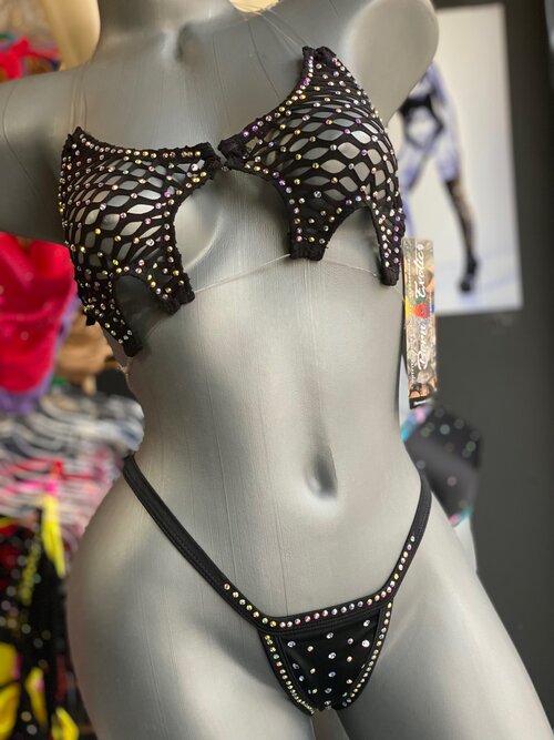 Black Net star bra embellished with crystals paired with traditional thong. One size fits most. Limited quantity available. Upgrade your lingerie game with this unique set. Made with top-quality materials and perfected with sparkling crystals, it will elevate your style and make you stand out. Hurry, there are only a limited number of these luxurious sets available.