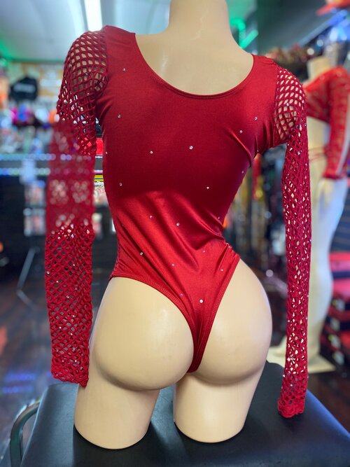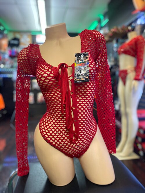 Red Bodysuit with sleeves lace up embellished with crystals. One size fits most. Made with premium spandex fabric in the US by us. This red bodysuit is designed with a lace-up embellishment featuring sparkling crystals that adds a touch of elegance to any outfit. Made with premium spandex fabric, this product is carefully crafted in the US for a comfortable and flattering fit.