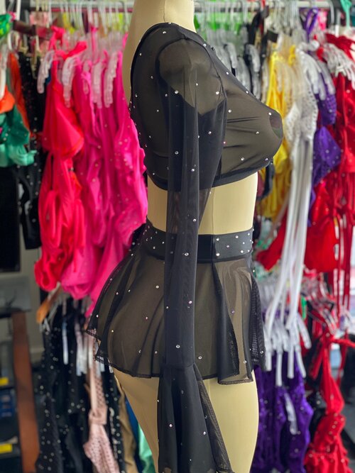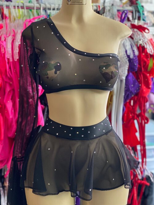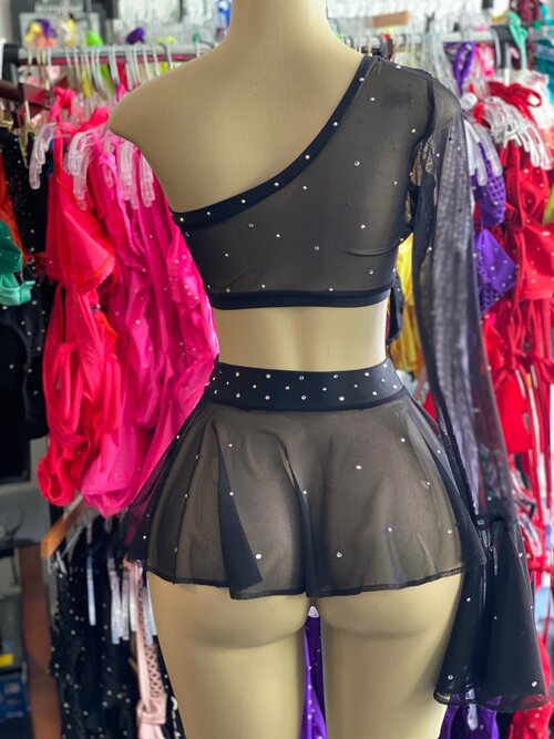 Mesh skirt with one arm crop top embellished with crystals. One size fits most. Made in the US by us;) Experience fashion at its most dazzling - perfect for a night out. This stunning one arm crop top with matching crystal embellished mesh skirt offers a perfectly tailored fit with just the right amount of sparkle. Plus, each piece is proudly made in the USA by our team of skilled artisans. Now that's luxury you can feel good about!