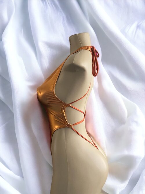 Metallic Bodysuit lace up back out. One size fits most. Expertly designed and crafted with durable metallic material, this bodysuit features a delicate and stylish lace up back and is available in one size that is sure to fit most.