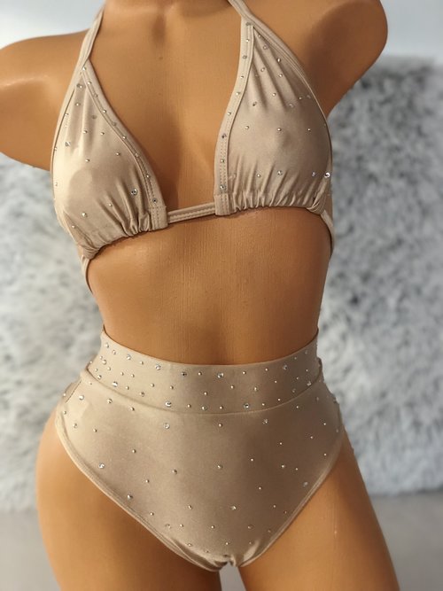 Made of premium spandex fabric for maximum stretch, these nude high waisted thong back shorts and embellished bra top offer not only a flawless and comfortable fit but also an elegant and sparkling look with its crystal decorations. Its one size fits most feature makes it an ideal choice for anyone looking for ultimate comfort and style in their activewear.
